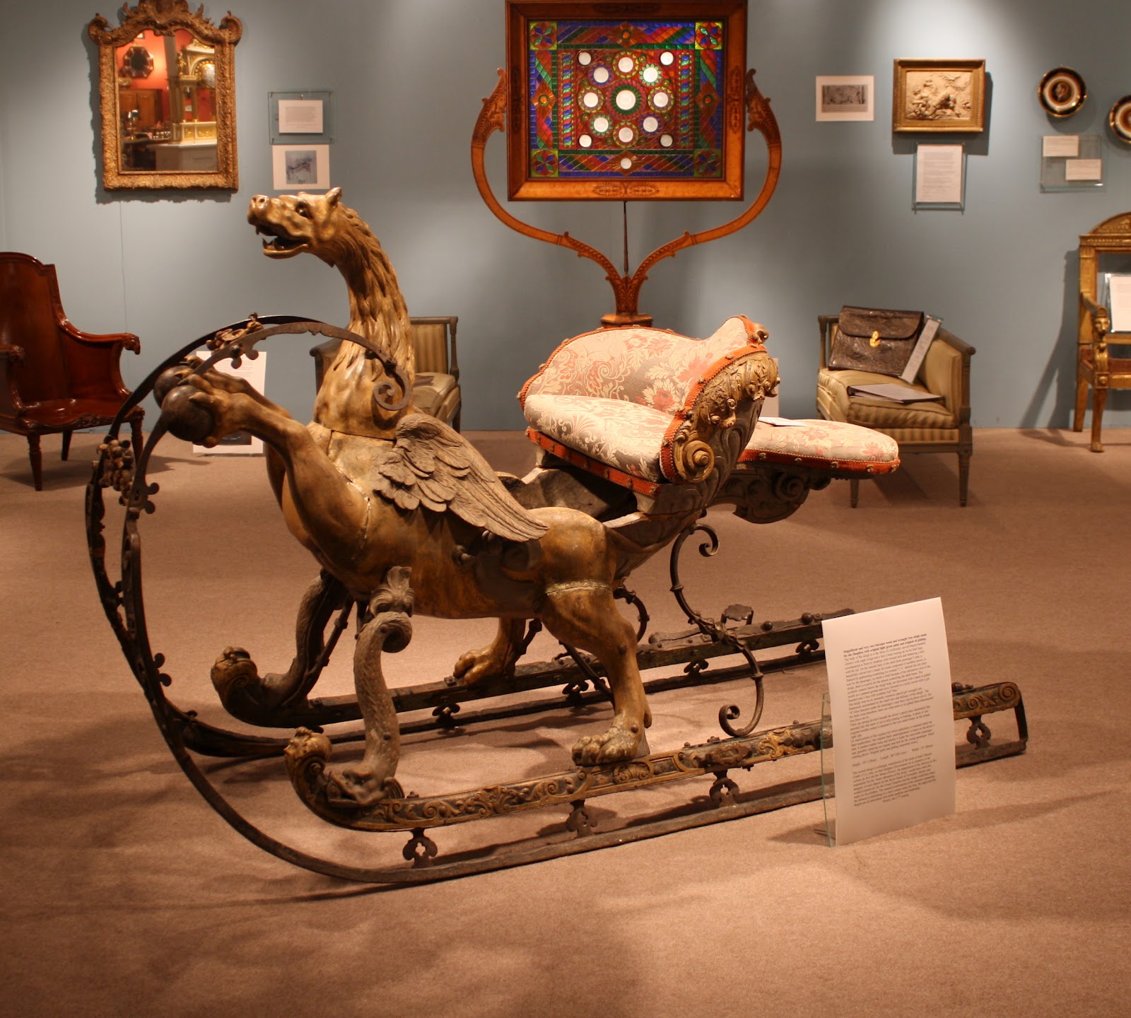 This spectacular French late 17th/early 18th century sleigh pulled by griffins may seem out of a fairy tale but it was designed by Jean Berain for the Dauphin. It is in Dalva Brothers' stand which is dedicated to French royal pieces including a fire screen made for Marie Antoinette.