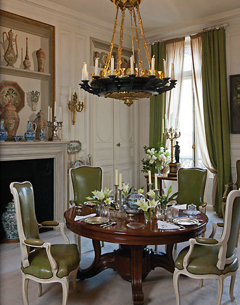 Rochas' dining room, with one of six trompe l'oeil panels of famille verte Chinese porcelain painted by Alexandre Serebriakoff, lot 20, visible.