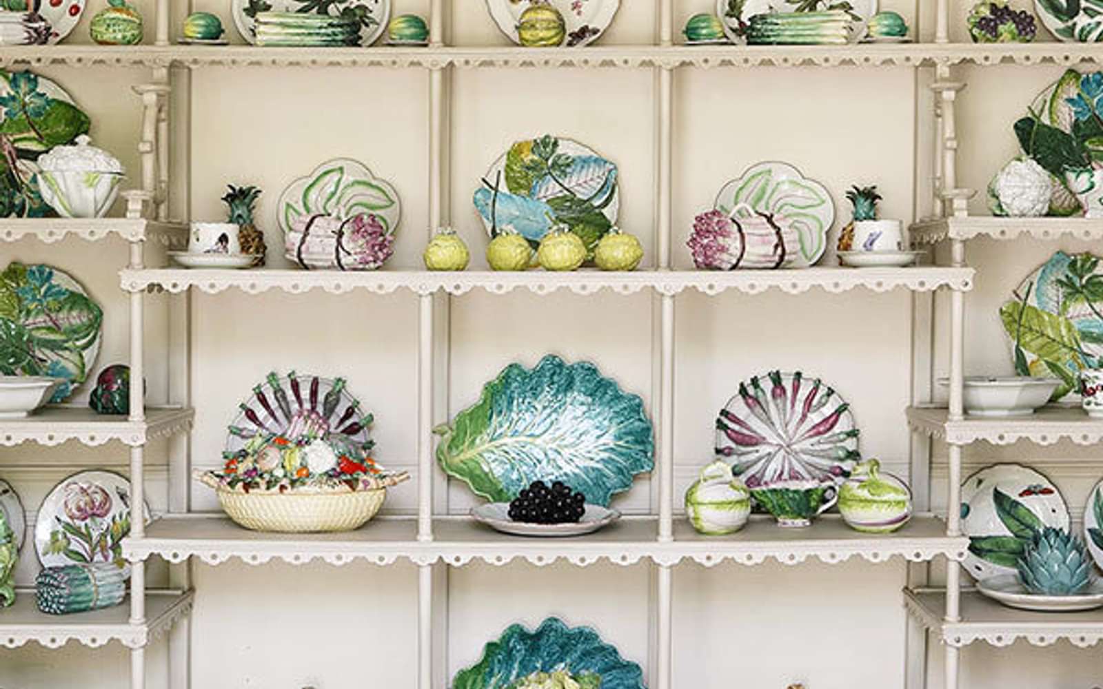 If you viewed the sale, you couldn't have missed the ginormous five-tier etagere arranged with all manner of porcelain cabbage, asparagus, and lettuce, faithfully replicating how it was in her Virginia house*, as seen above.