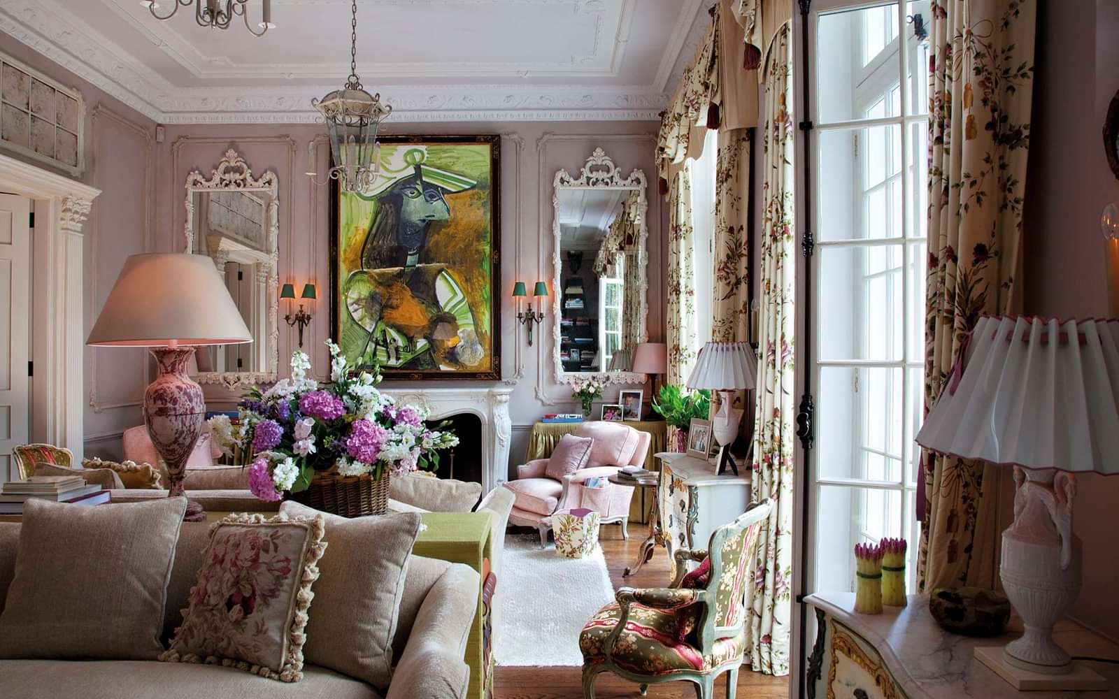 There isn't anything I don't love here: that it's a London residence with a country house vibe (given off by the floral curtains); the pleated lamp shades threaded through with ribbon; the ceramic asparagus; the chalky white mirrors and moldings; the slightly off-palette upholstery used on a pair of fauteuils which, as Mario Buatta taught me, makes the room look like it evolved over time; and of course the spectacular Picasso over the mantel. Here a Madeleine Castaing maxim comes to mind: that every room should have something ugly in it. Its rawness and "unpretty" earthy colors add a frisson and make the room anything but old fashioned.